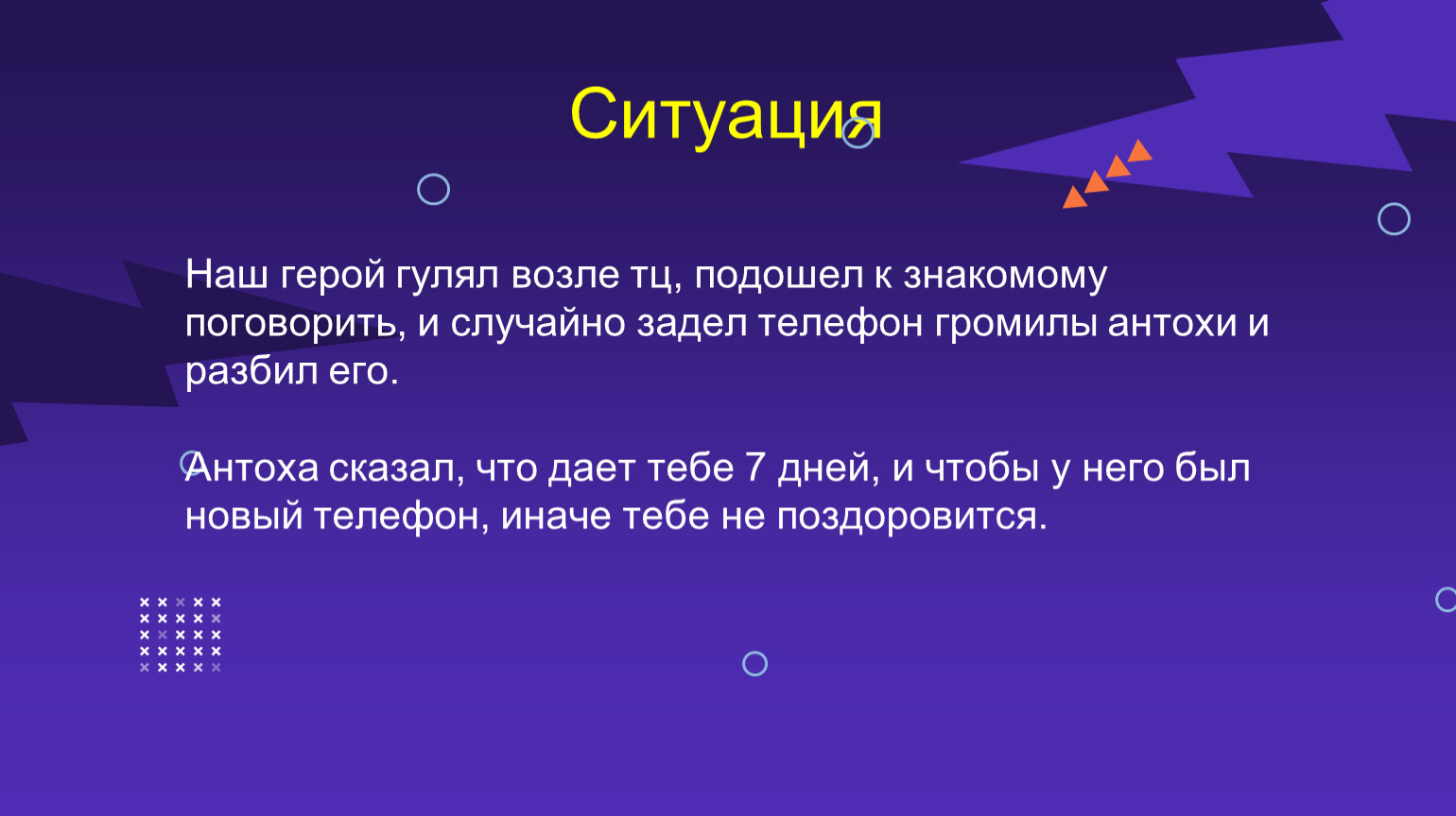 Наш герой гулял возле тц, подошел к знакомому поговорить, и случайно задел телефон громилы антохи и разбил его.