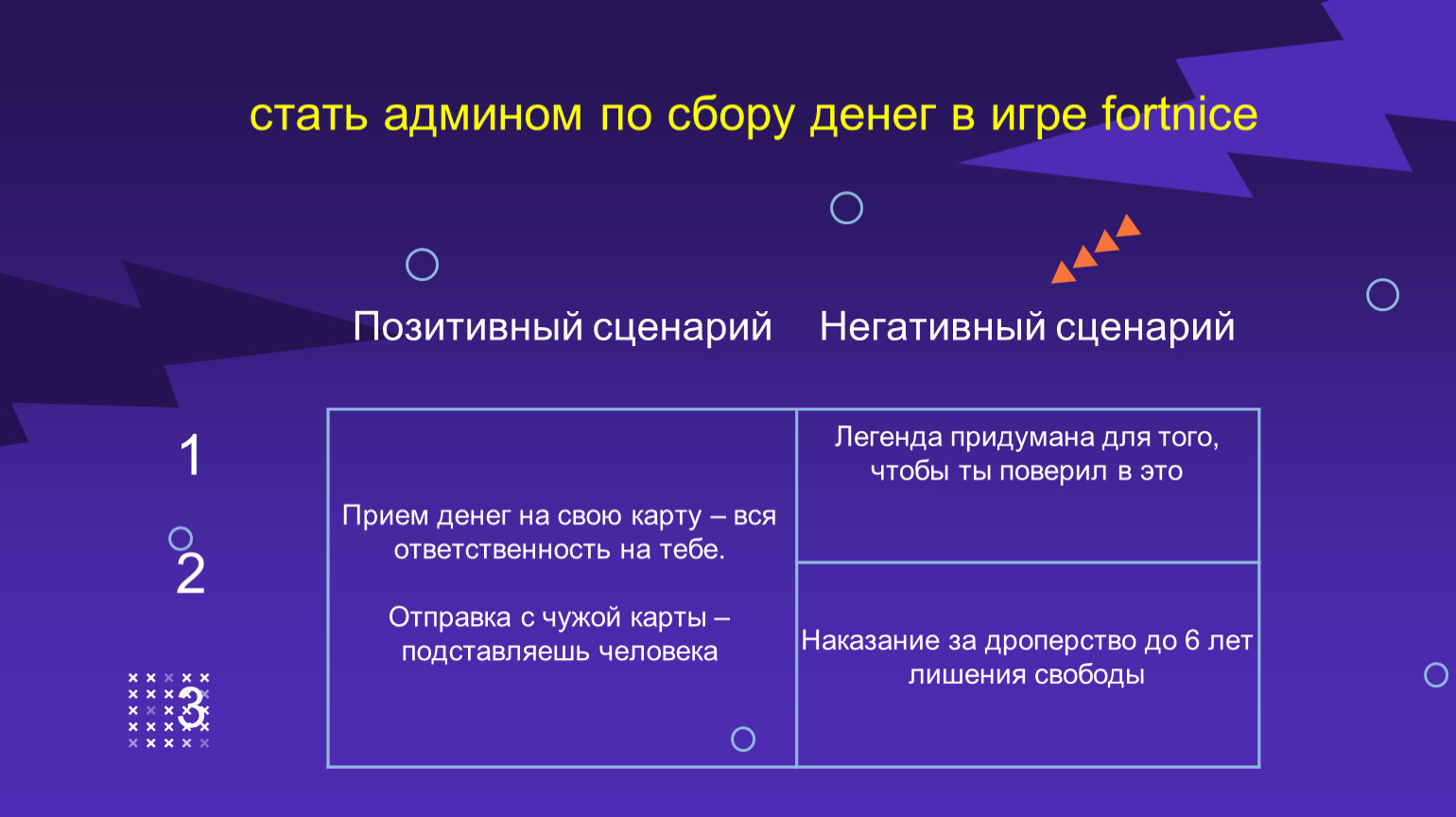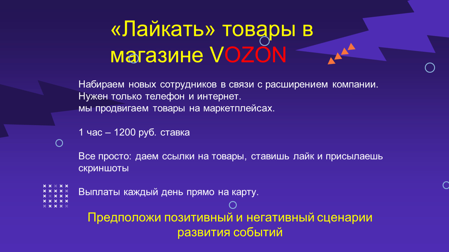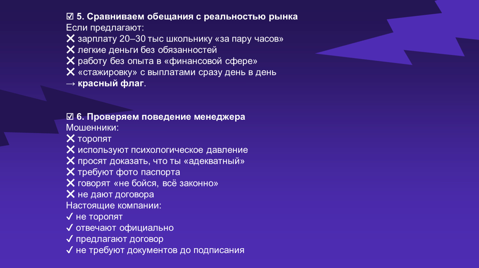 Если предлагают:❌ зарплату 20–30 тыс школьнику «за пару часов»❌ легкие деньги без обязанностей❌ работу без опыта в «финансовой сфере»❌ «стажировку» с выплатами сразу день в день