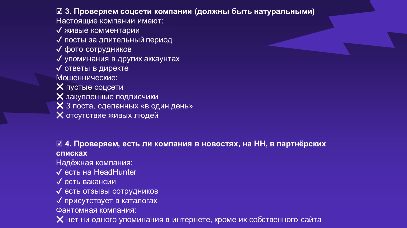 Настоящие компании имеют:✔ живые комментарии✔ посты за длительный период✔ фото сотрудников✔ упоминания в других аккаунтах✔ ответы в директе
