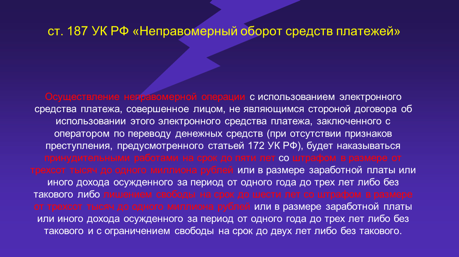 ст. 187 УК РФ «Неправомерный оборот средств платежей»
