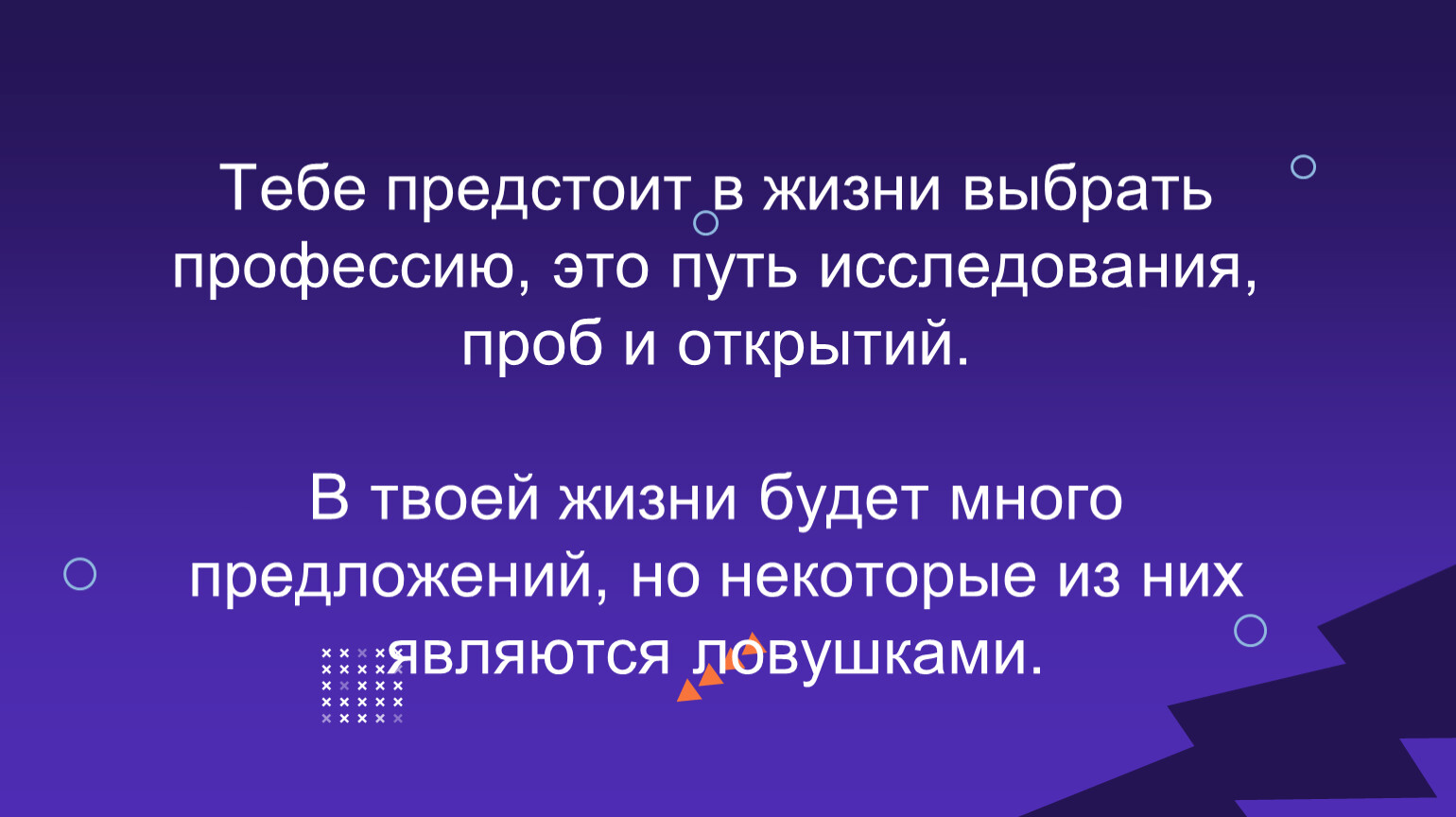 Тебе предстоит в жизни выбрать профессию, это путь исследования, проб и открытий.