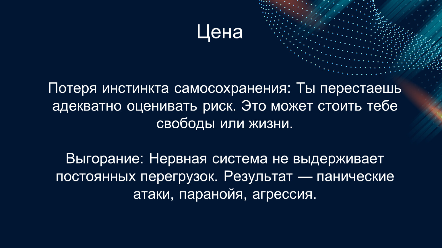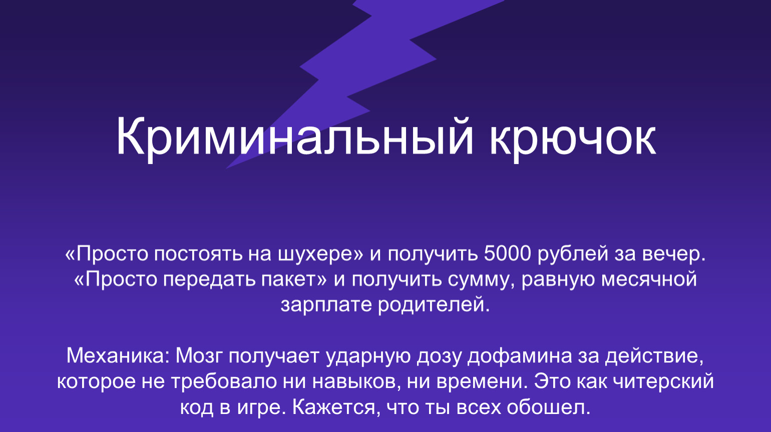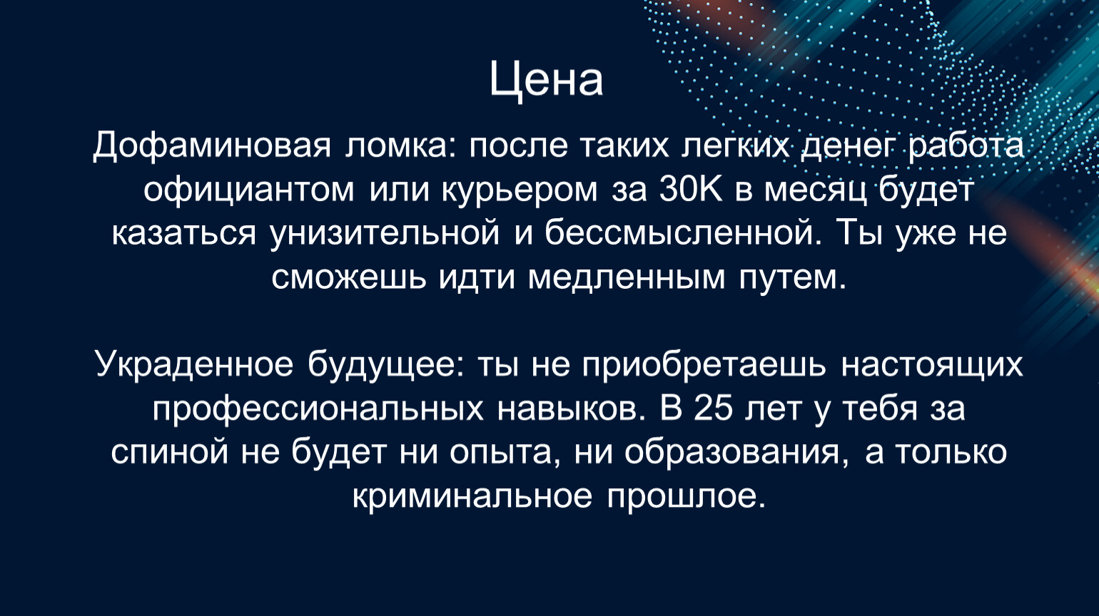 Дофаминовая ломка: после таких легких денег работа официантом или курьером за 30K в месяц будет казаться унизительной и бессмысленной. Ты уже не сможешь идти медленным путем.