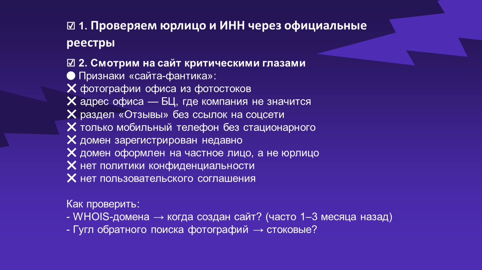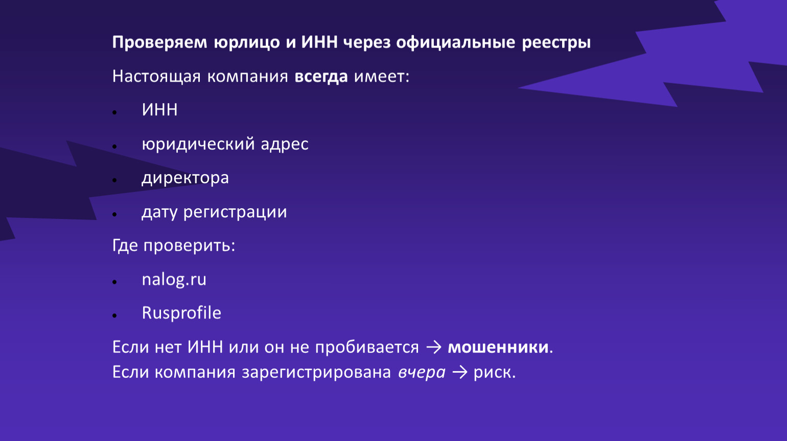 Если нет ИНН или он не пробивается → мошенники.Если компания зарегистрирована вчера → риск.