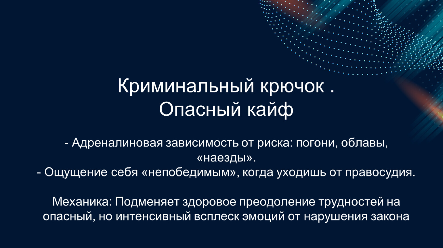 Механика: Подменяет здоровое преодоление трудностей на опасный, но интенсивный всплеск эмоций от нарушения закона