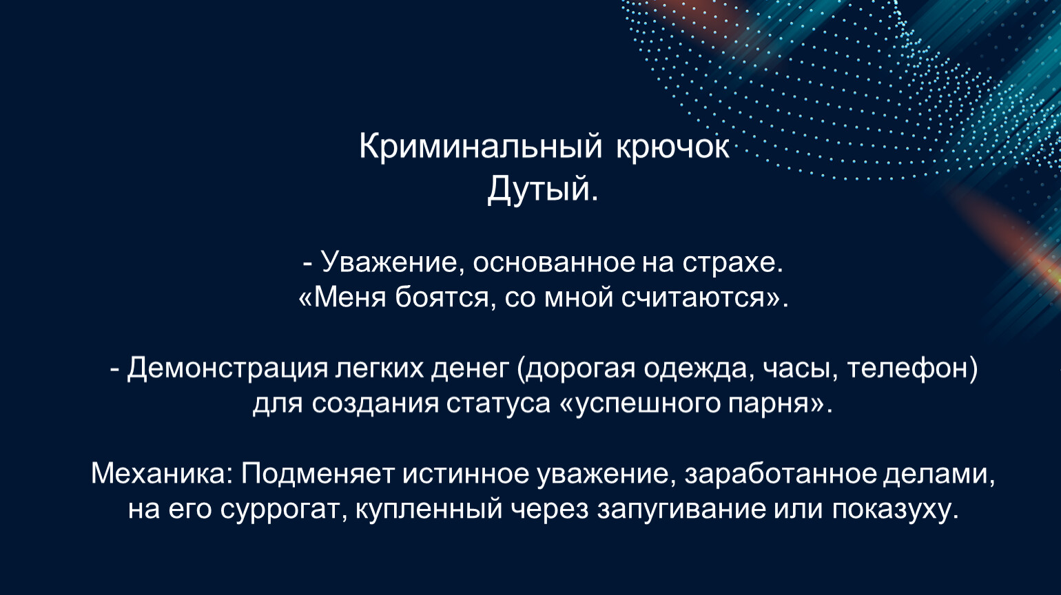 - Адреналиновая зависимость от риска: погони, облавы, «наезды».- Ощущение себя «непобедимым», когда уходишь от правосудия.