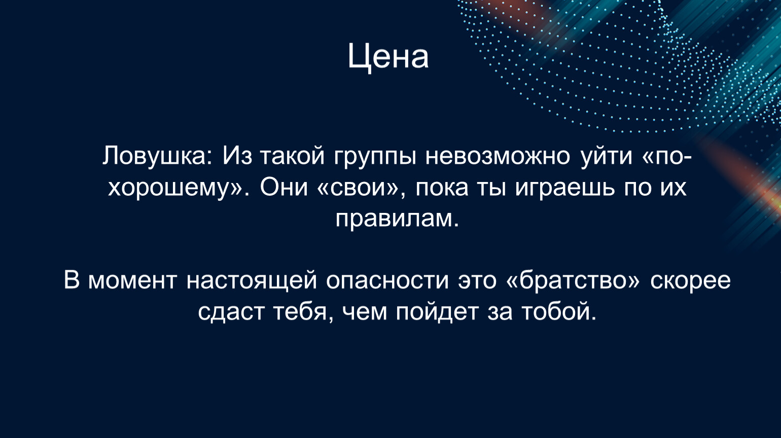 Ловушка: Из такой группы невозможно уйти «по-хорошему». Они «свои», пока ты играешь по их правилам.