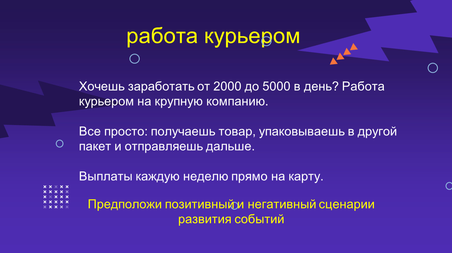 Нашему герою хочется заработать свои первые деньги, и ему как раз сегодня в личные сообщения в тг пришло сообщение.