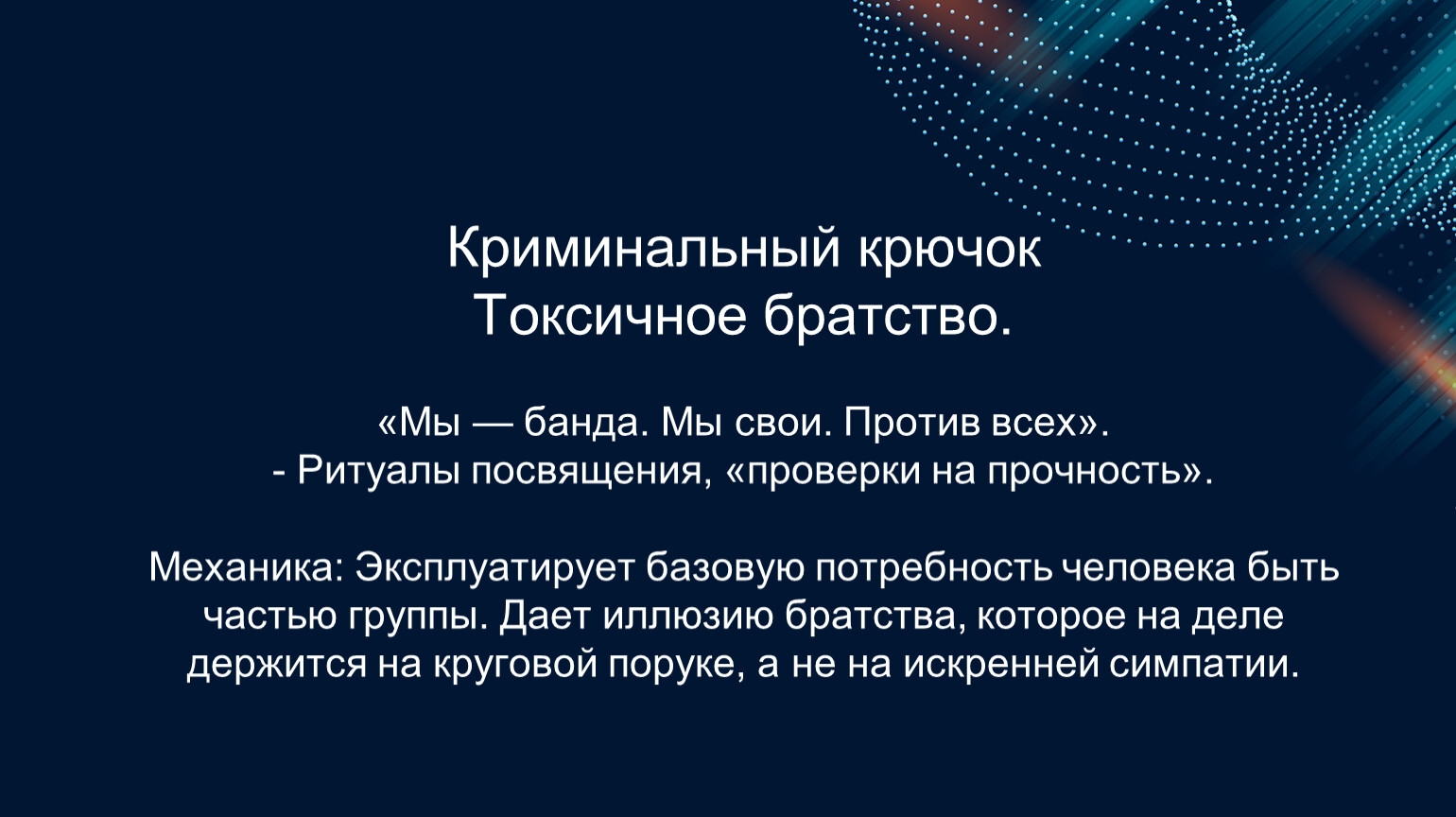 Механика: Эксплуатирует базовую потребность человека быть частью группы. Дает иллюзию братства, которое на деле держится на круговой поруке, а не на искренней симпатии.
