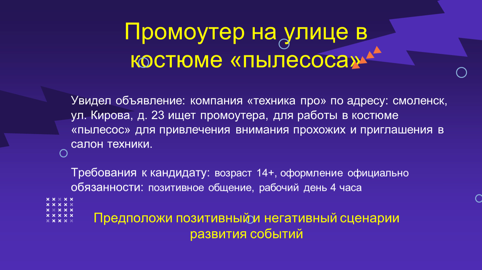 Увидел объявление: компания «техника про» по адресу: смоленск, ул. Кирова, д. 23 ищет промоутера, для работы в костюме «пылесос» для привлечения внимания прохожих и приглашения в салон техники.