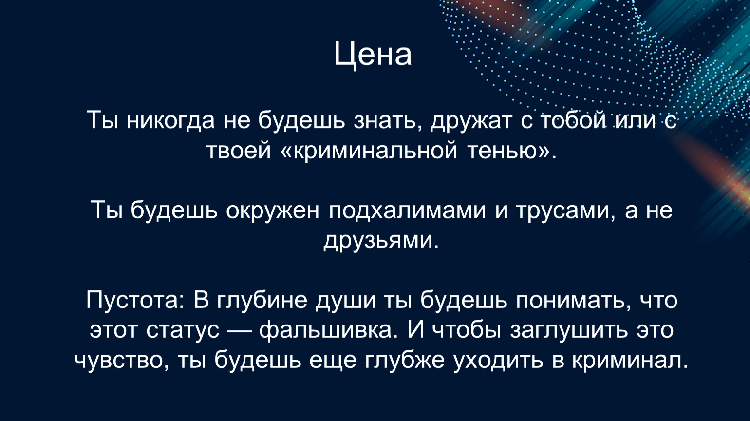 Пустота: В глубине души ты будешь понимать, что этот статус — фальшивка. И чтобы заглушить это чувство, ты будешь еще глубже уходить в криминал.