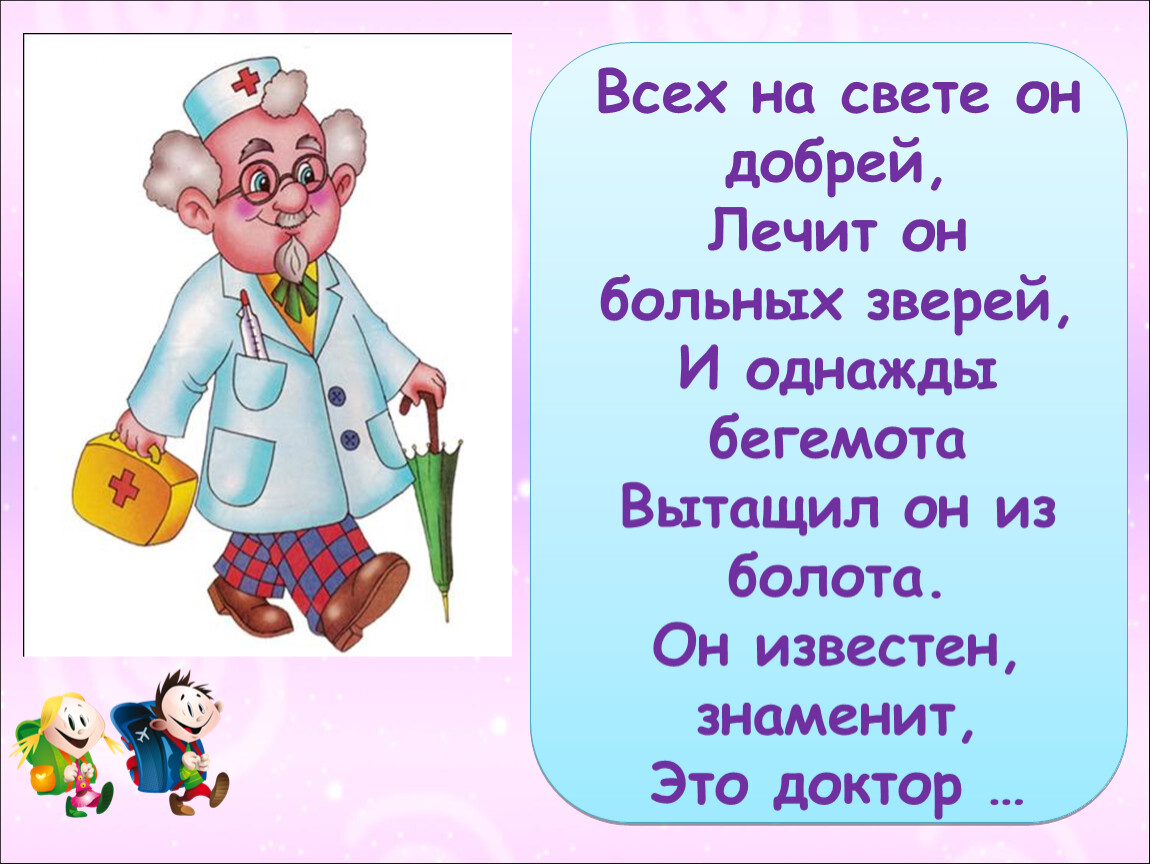 Всех на свете он добрей,Лечит он больных зверей,И однажды бегемотаВытащил он из болота.Он известен, знаменит,Это доктор …