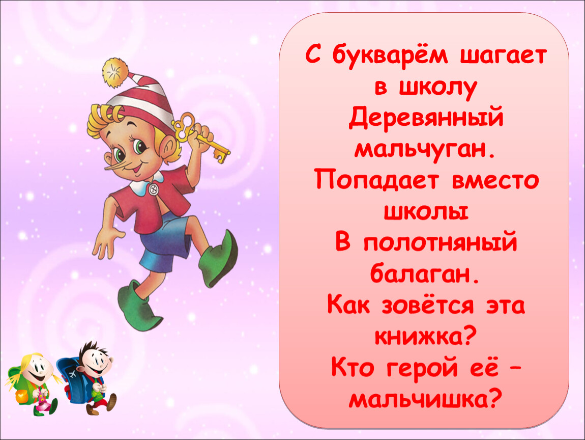 С букварём шагает в школуДеревянный мальчуган.Попадает вместо школыВ полотняный балаган.Как зовётся эта книжка?Кто герой её – мальчишка?