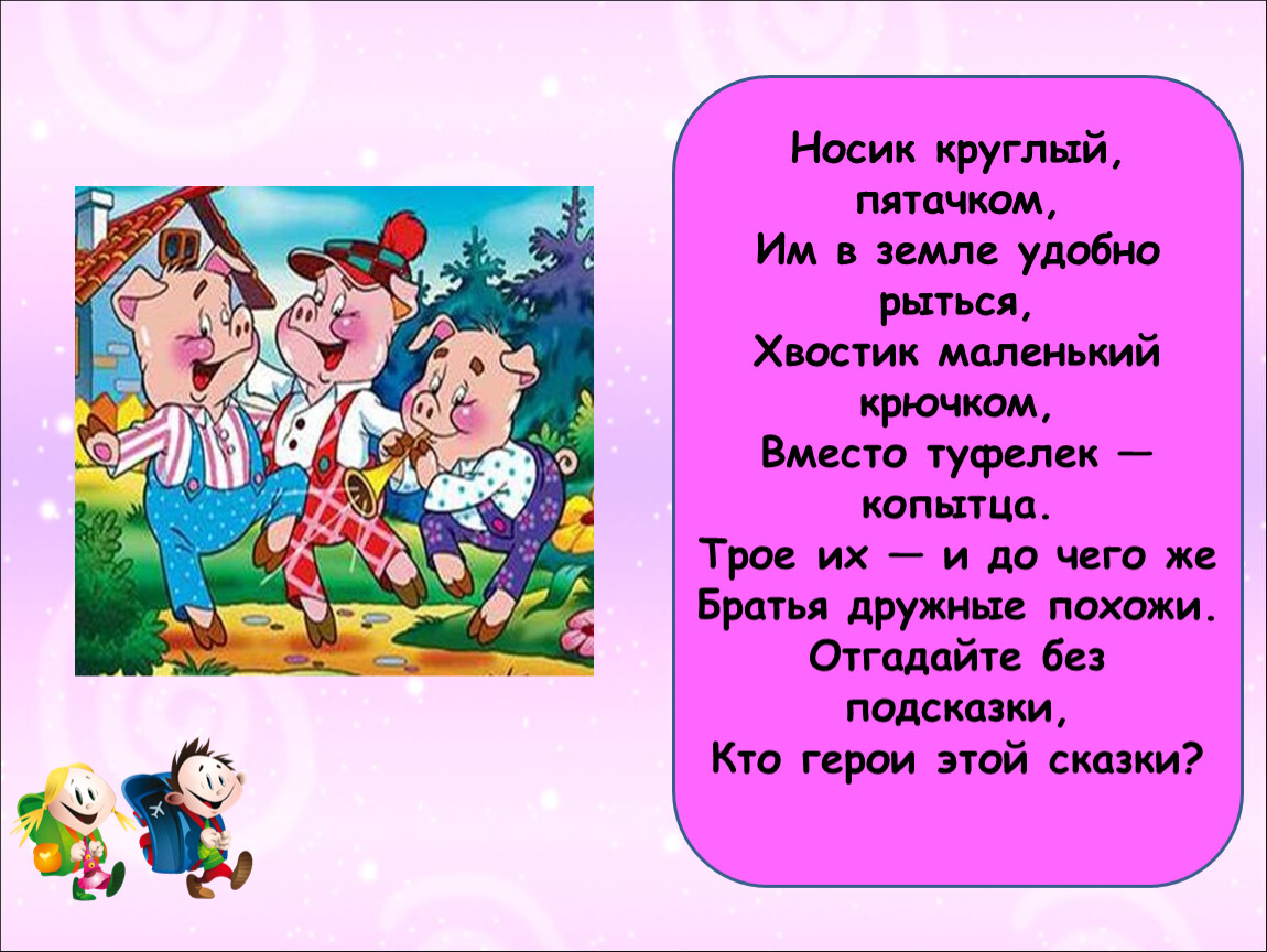 Носик круглый, пятачком, Им в земле удобно рыться, Хвостик маленький крючком, Вместо туфелек — копытца. Трое их — и до чего же Братья дружные похожи. Отгадайте без подсказки, Кто герои этой сказки?