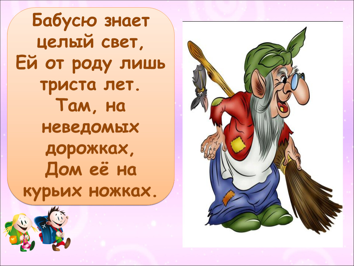 Бабусю знает целый свет,Ей от роду лишь триста лет.Там, на неведомых дорожках,Дом её на курьих ножках.