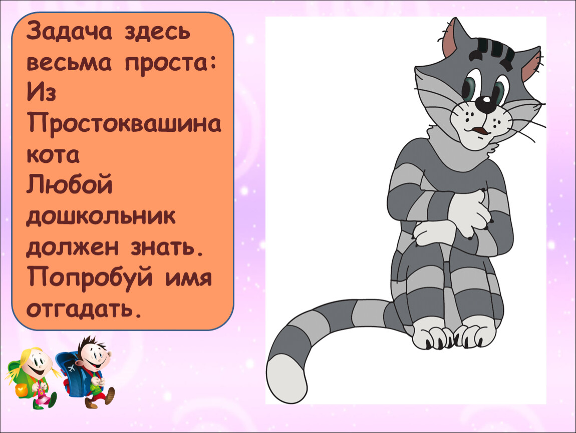 Задача здесь весьма проста:Из Простоквашина котаЛюбой дошкольник должен знать.Попробуй имя отгадать.