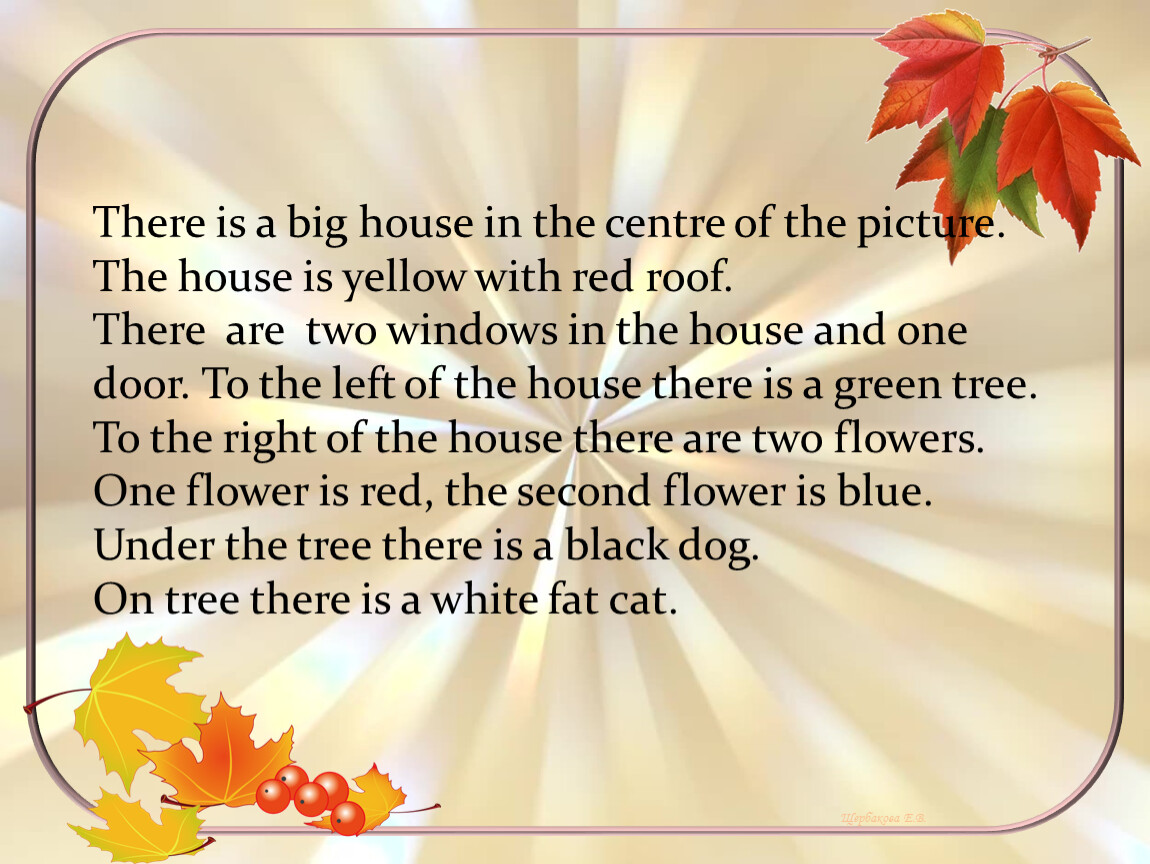 To the right of the house there are two flowers. One flower is red, the second flower is blue. Under the tree there is a black dog.