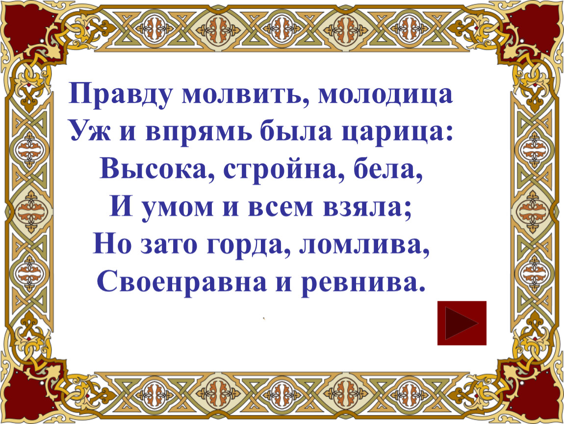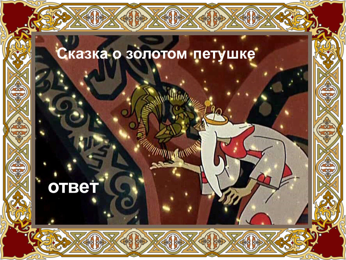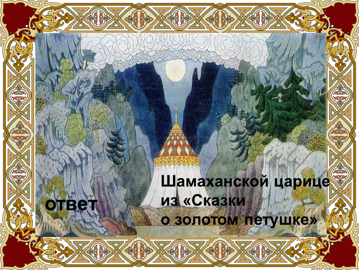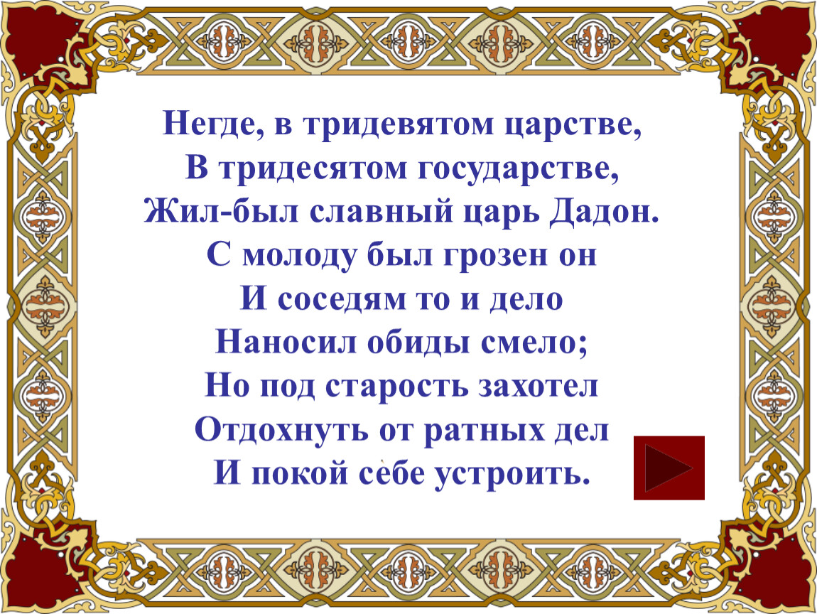 Негде, в тридевятом царстве,В тридесятом государстве,Жил-был славный царь Дадон.С молоду был грозен он