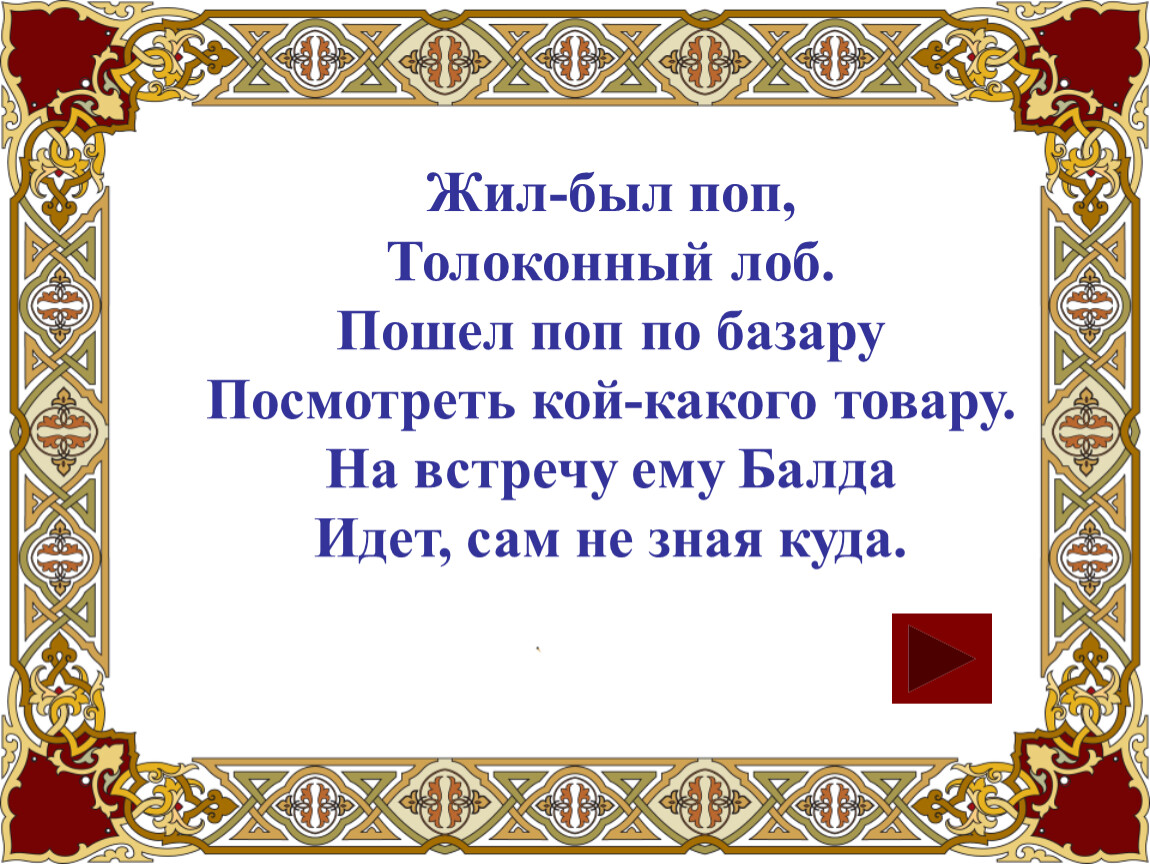 Жил-был поп,Толоконный лоб.Пошел поп по базаруПосмотреть кой-какого товару.
