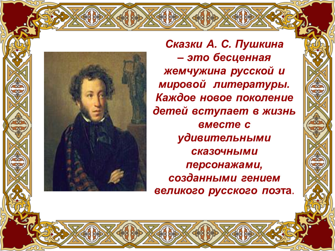 Сказки А. С. Пушкина – это бесценная жемчужина русской и мировой литературы. Каждое новое поколение детей вступает в жизнь вместе с удивительными сказочными персонажами, созданными гением великого русского поэта.