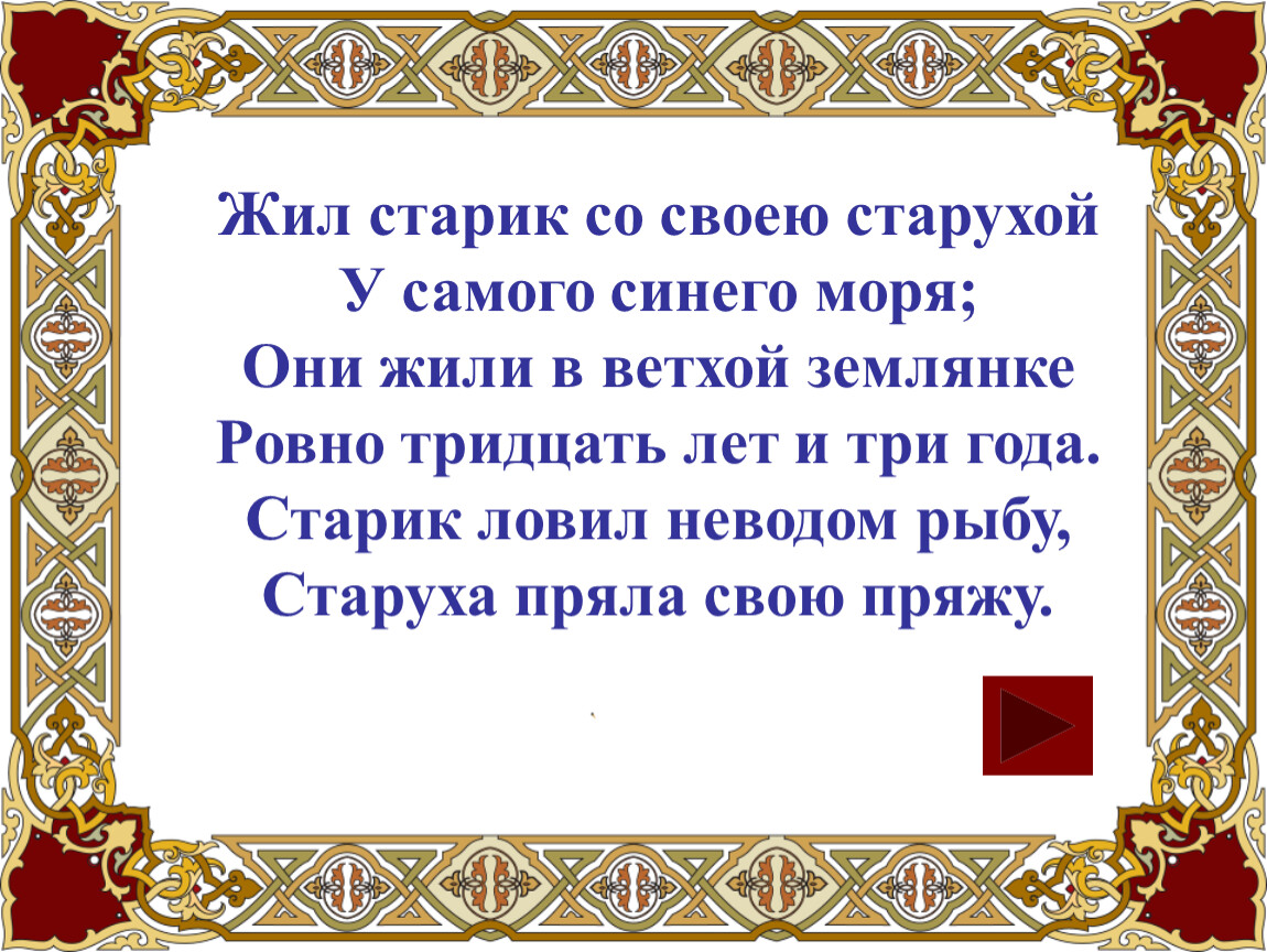 Жил старик со своею старухойУ самого синего моря;Они жили в ветхой землянкеРовно тридцать лет и три года.
