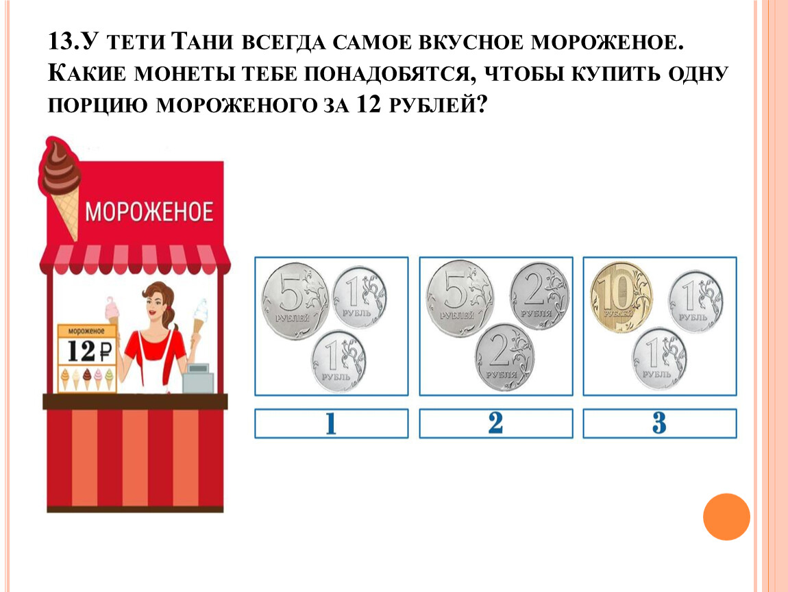 13.У тети Тани всегда самое вкусное мороженое. Какие монеты тебе понадобятся, чтобы купить одну порцию мороженого за 12 рублей?