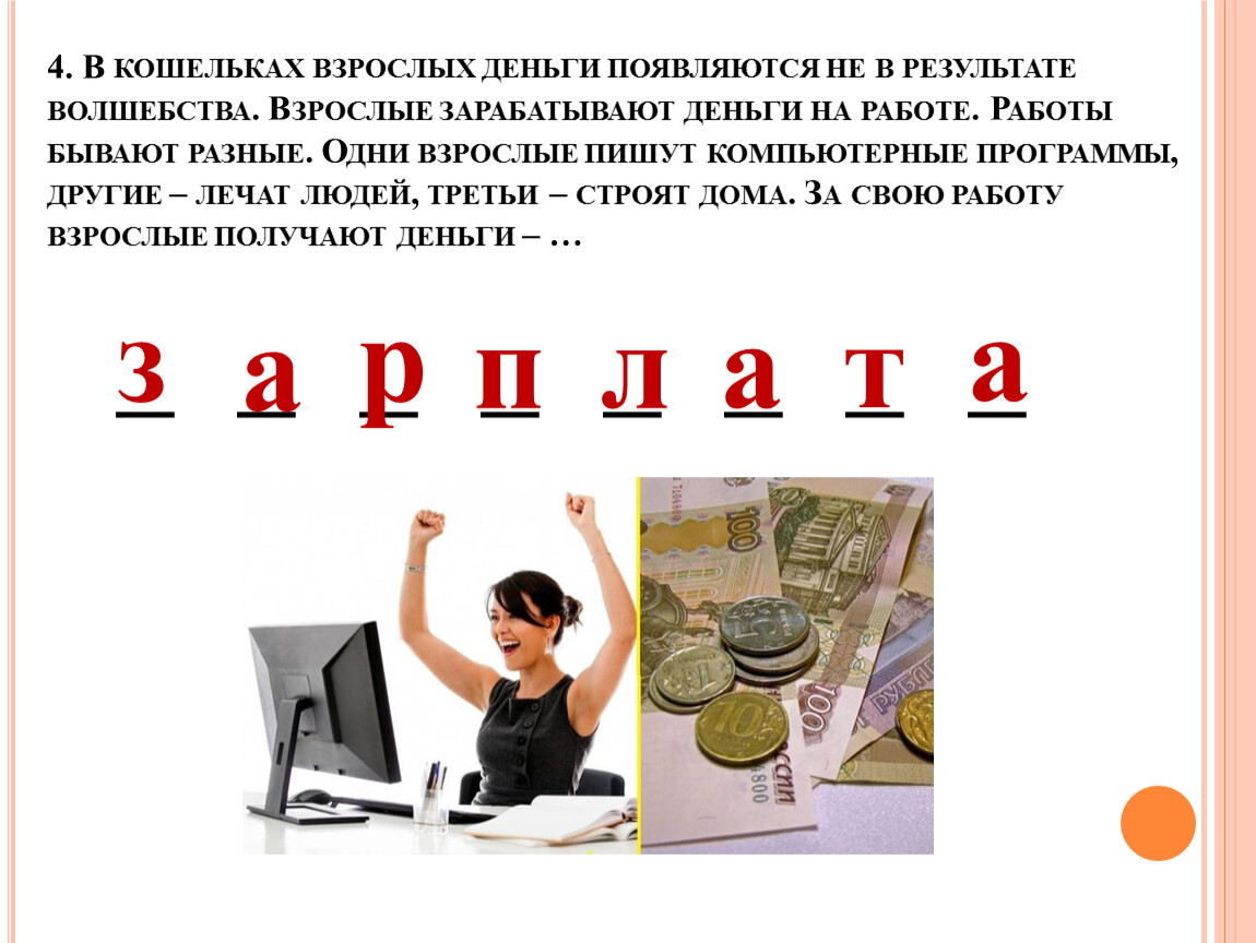 4. В кошельках взрослых деньги появляются не в результате волшебства. Взрослые зарабатывают деньги на работе. Работы бывают разные. Одни взрослые пишут компьютерные программы, другие – лечат людей, третьи – строят дома. За свою работу взрослые получают деньги – …