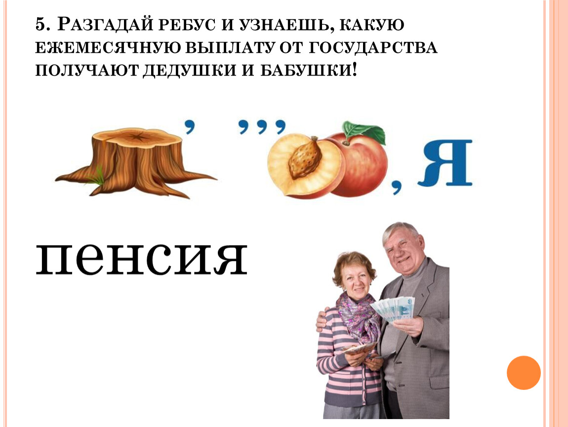 5. Разгадай ребус и узнаешь, какую ежемесячную выплату от государства получают дедушки и бабушки!