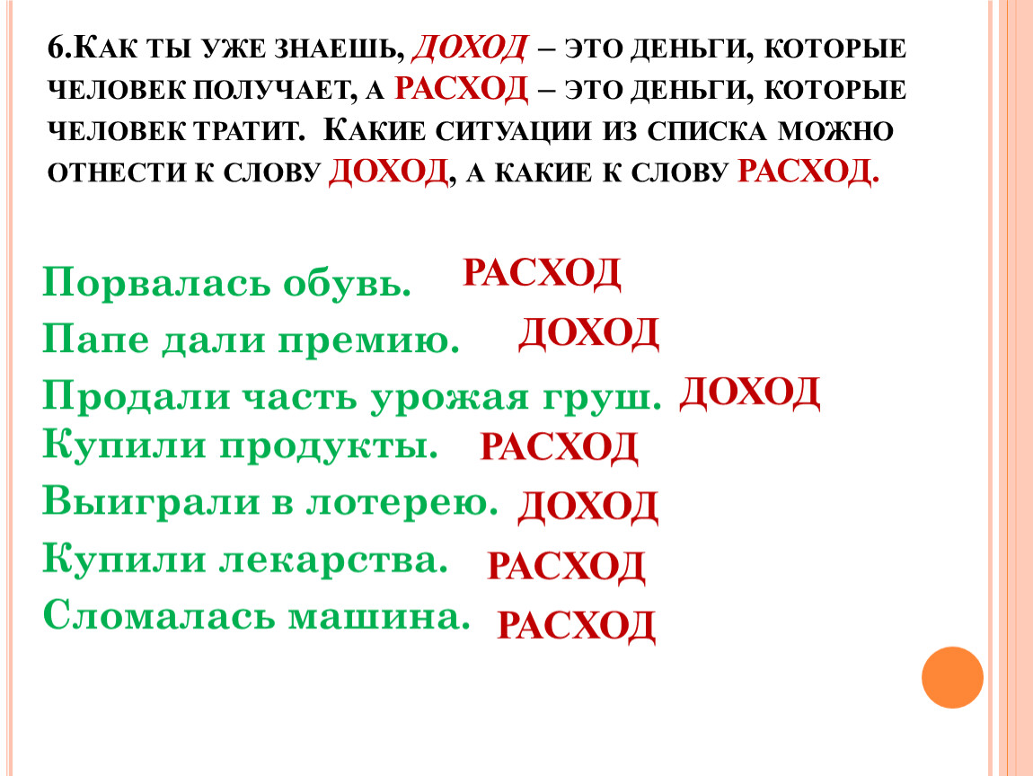6.Как ты уже знаешь, ДОХОД – это деньги, которые человек получает, а РАСХОД – это деньги, которые человек тратит. Какие ситуации из списка можно отнести к слову ДОХОД, а какие к слову РАСХОД.