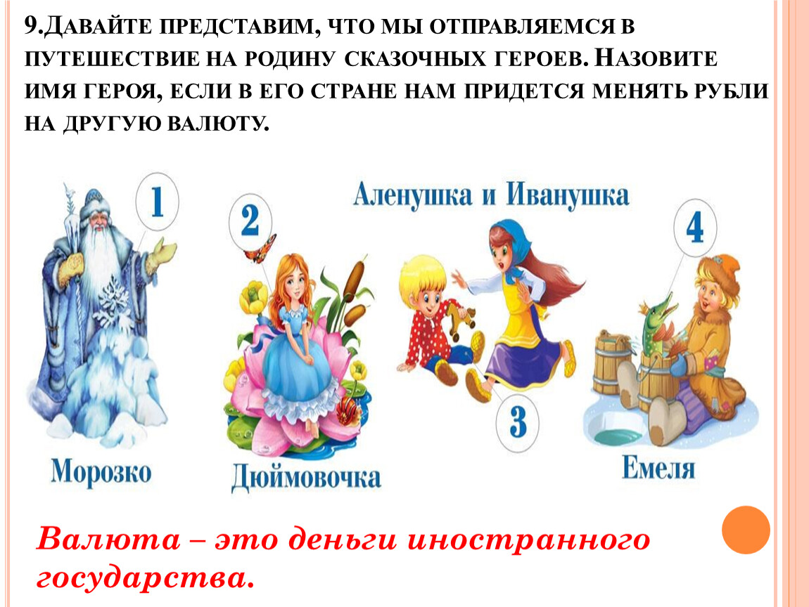 9.Давайте представим, что мы отправляемся в путешествие на родину сказочных героев. Назовите имя героя, если в его стране нам придется менять рубли на другую валюту.