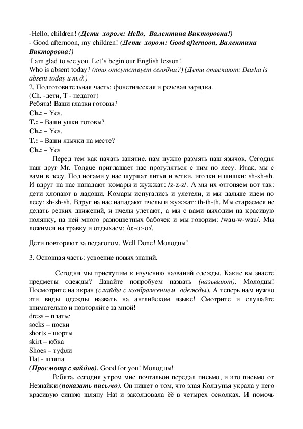 Ход занятияHello, children! (Дети хором: Hello, Валентина Викторовна!)