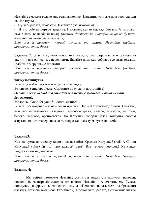 одежды, дети считают «one, two, three»). Посмотрите, ребята, Незнайкина шляпарасколдована, теперь он ее сможет забрать и продолжать ее носить. И это