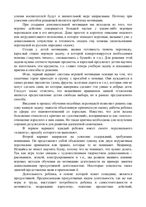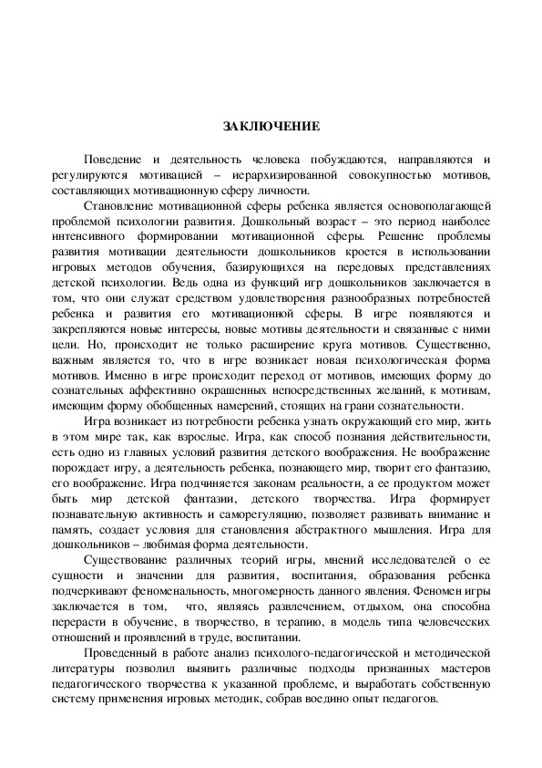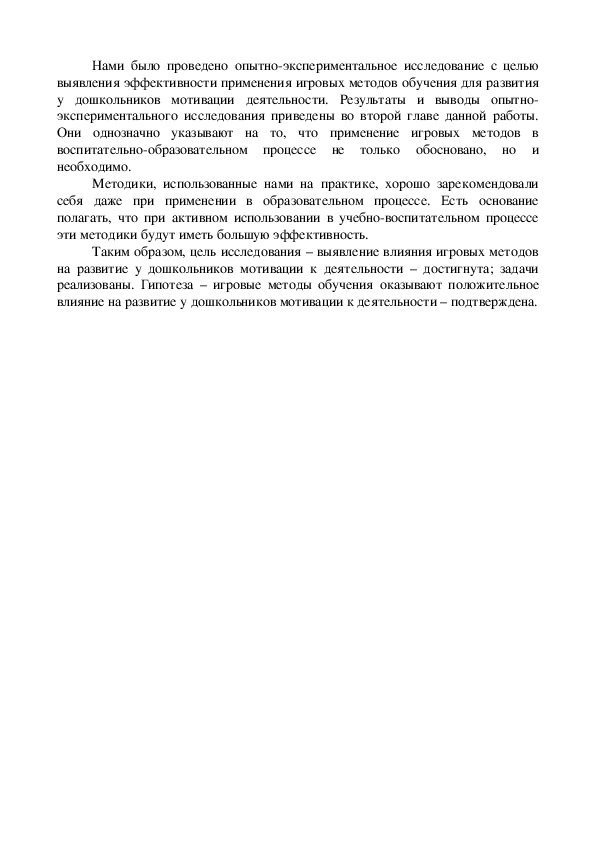 Содержание педагогического исследования, а так же проведенный в работе анализ психолого-педагогической и методической литературы позволил выявить различные подходы признанных мастеров педагогического творчества к указанной проблеме, и выработать собственную систему применения игровых методик, собрав воедино опыт педагогов. Адекватность требований и нагрузок, предъявляемых ребенку в процессе занятия, способствует оптимизации занятия и повышению его эффективности. Объем содержания материала определяется с учетом объема памяти, внимания, возможностей детей, их умственной работоспособности. Методики, использованные нами на практике, хорошо зарекомендовали себя даже при применении в образовательном процессе. Есть основание полагать, что при активном использовании в учебно-воспитательном процессе эти методики будут иметь большую эффективность.
