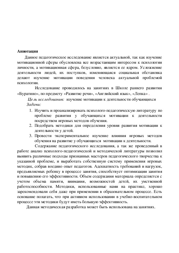 Исследование проводилось на занятиях в Школе раннего развития «Буратино», по предмету «Развитие речи», «Английский язык», «Лепка» .