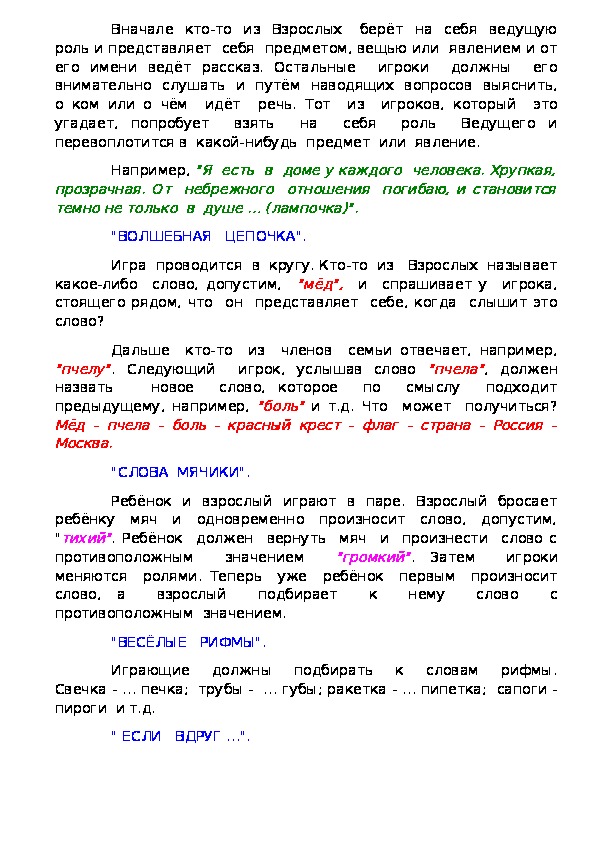 Родителям предлагаются игры, которые помогут Вашему ребёнку подружиться со словом, научат рассказывать, отыскивать интересные слова, а в итоге сделать речь Вашего ребёнка богаче и разнообразнее. Эти игры могут быть интересны и полезны всем членам семьи. В них можно играть в выходные дни, в праздники, в будние дни вечерами, когда взрослые и дети собираются вместе после очередного рабочего дня.