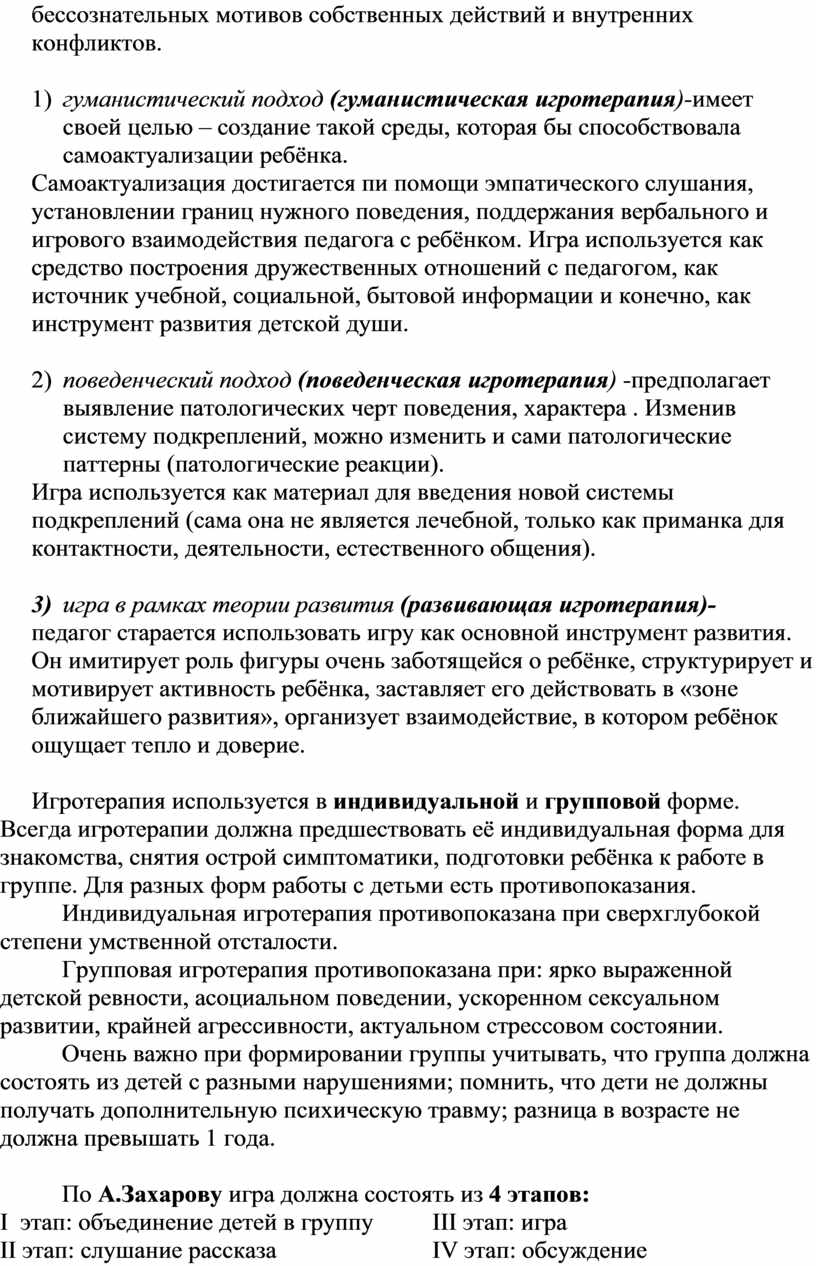 2) гуманистический подход (гуманистическая игротерапия)-имеет своей целью – создание такой среды, которая бы способствовала самоактуализации ребёнка.