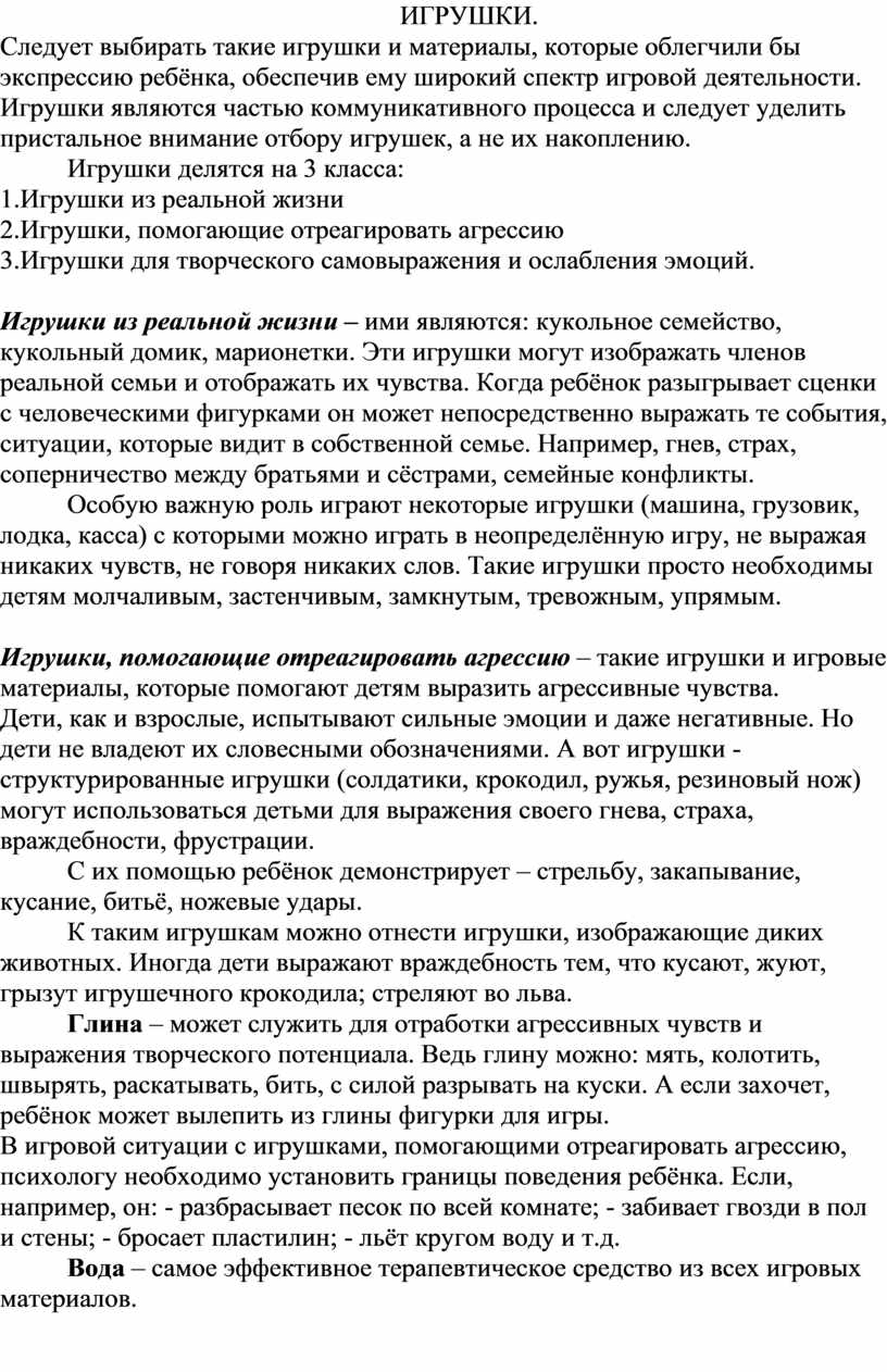 Дети, как и взрослые, испытывают сильные эмоции и даже негативные. Но дети не владеют их словесными обозначениями. А вот игрушки - структурированные игрушки (солдатики, крокодил, ружья, резиновый нож) могут использоваться детьми для выражения своего гнева, страха, враждебности, фрустрации.