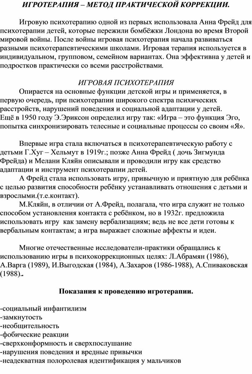 Таким образом, спектр применения психокоррекционной игротерапии очень широк.