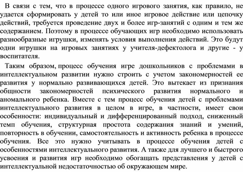 Таким образом, процесс обучения игре дошкольников с проблемами в интеллектуальном развитии нужно строить с учетом закономерностей ее развития у нормально развивающихся детей. Это вытекает из признания общности закономерностей психического развития нормального и аномального ребенка. Вместе с тем процесс обучения детей с проблемами интеллектуального развития в целом в игре, в частности, имеет свои особенности: индивидуальный и дифференцированный подход, сниженный темп обучения, структурная простота содержания знаний и умений, повторность в обучении, самостоятельность и активность ребенка в процессе обучения. Все это нужно учитывать в процессе обучения детей с особенностями интеллектуального развития. А также для лучшего и быстрого усвоения и развития игр необходимо обогащать представления у детей с интеллектуальной недостаточностью об окружающем мире.