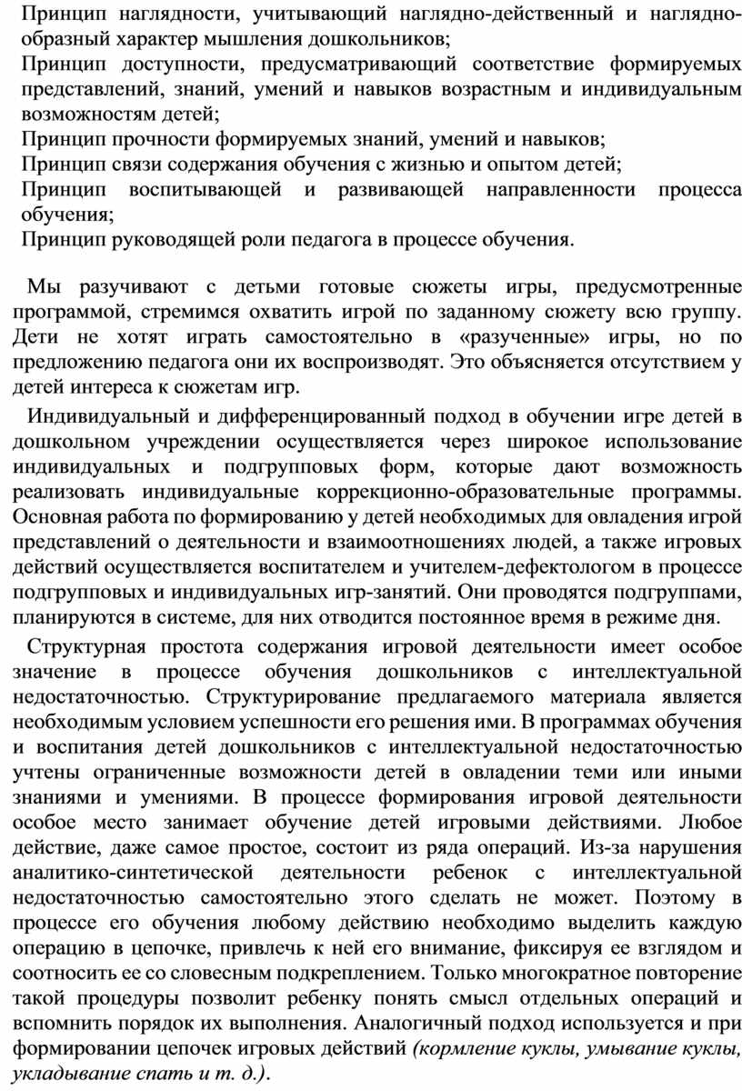 Структурная простота содержания игровой деятельности имеет особое значение в процессе обучения дошкольников с интеллектуальной недостаточностью. Структурирование предлагаемого материала является необходимым условием успешности его решения ими. В программах обучения и воспитания детей дошкольников с интеллектуальной недостаточностью учтены ограниченные возможности детей в овладении теми или иными знаниями и умениями. В процессе формирования игровой деятельности особое место занимает обучение детей игровыми действиями. Любое действие, даже самое простое, состоит из ряда операций. Из-за нарушения аналитико-синтетической деятельности ребенок с интеллектуальной недостаточностью самостоятельно этого сделать не может. Поэтому в процессе его обучения любому действию необходимо выделить каждую операцию в цепочке, привлечь к ней его внимание, фиксируя ее взглядом и соотносить ее со словесным подкреплением. Только многократное повторение такой процедуры позволит ребенку понять смысл отдельных операций и вспомнить порядок их выполнения. Аналогичный подход используется и при формировании цепочек игровых действий (кормление куклы, умывание куклы, укладывание спать и т. д.).