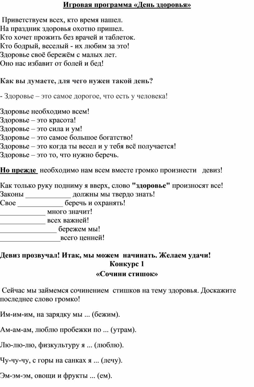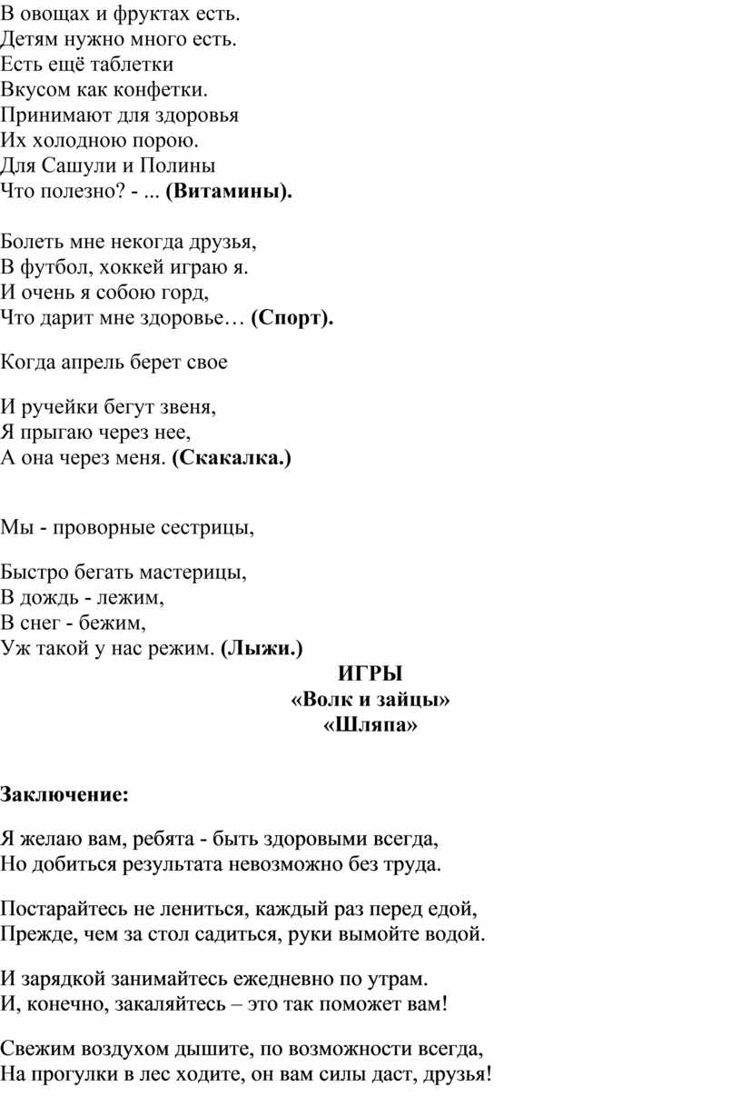 Сейчас мы займемся сочинением стишков на тему здоровья. Доскажите последнее слово громко!