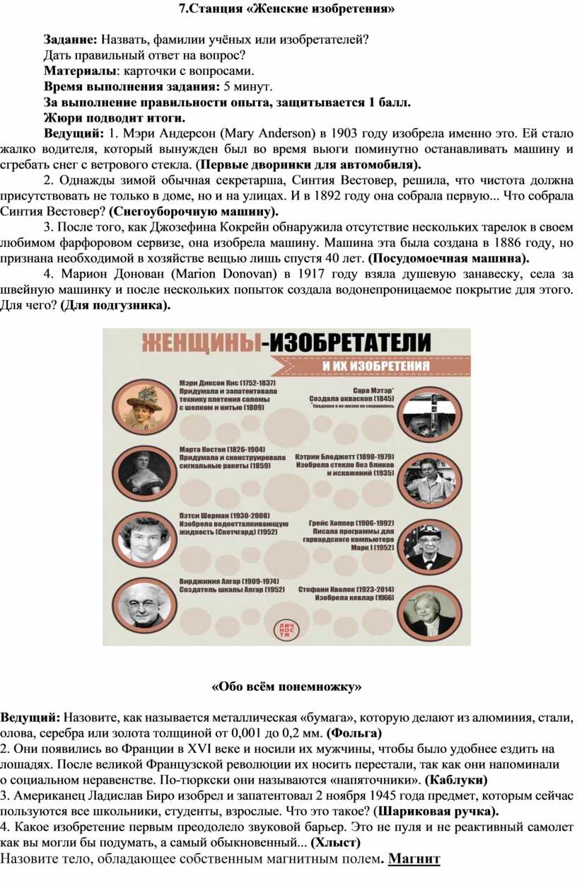 Ведущий: 1. Мэри Андерсон (Mary Anderson) в 1903 году изобрела именно это. Ей стало жалко водителя, который вынужден был во время вьюги поминутно останавливать машину и сгребать снег с ветрового стекла. (Первые дворники для автомобиля).