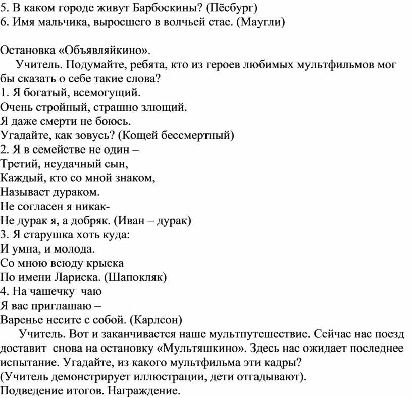 Учитель. Вот и заканчивается наше мультпутешествие. Сейчас нас поезд доставит снова на остановку «Мультяшкино». Здесь нас ожидает последнее испытание. Угадайте, из какого мультфильма эти кадры?
