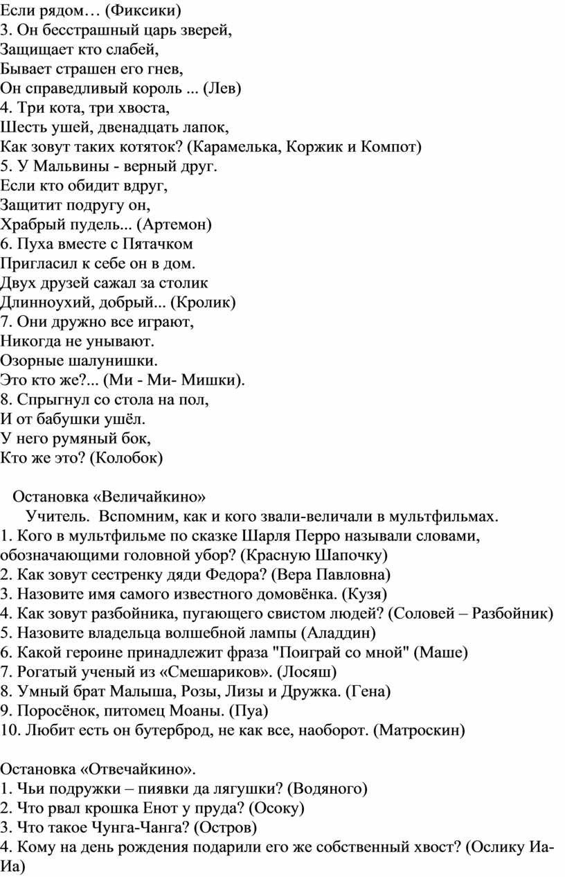 Оборудование: плакаты с названием остановок, изображение поезда, иллюстрации к мультфильмам.