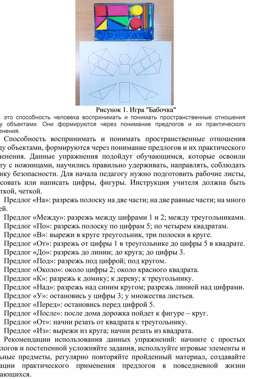 Способность воспринимать и понимать пространственные отношения между объектами, формируются через понимание предлогов и их практического применения. Данные упражнения подойдут обучающимся, которые освоили работу с ножницами, научились правильно удерживать, направлять, соблюдать технику безопасности. Для начала педагогу нужно подготовить рабочие листы, нарисовать или написать цифры, фигуры. Инструкция учителя должна быть короткой, четкой.