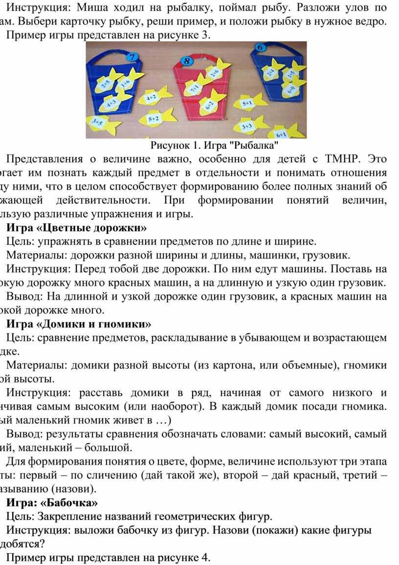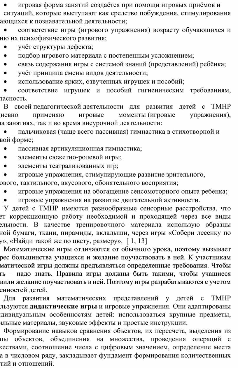 Для развития математических представлений у детей с ТМНР используются дидактические игры и игровые упражнения. Они адаптированы к индивидуальным особенностям детей: использоваться крупные предметы, тактильные материалы, звуковые эффекты и простые инструкции.