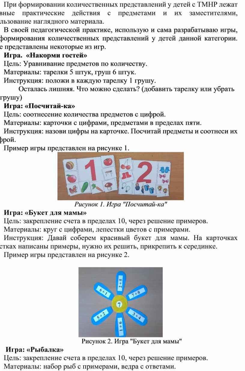 При формировании количественных представлений у детей с ТМНР лежат активные практические действия с предметами и их заместителями, использование наглядного материала.