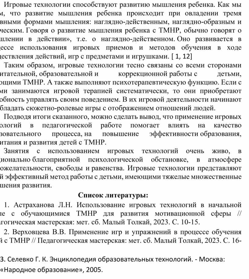 1. Астраханова Л.Н. Использование игровых технологий в начальной школе с обучающимися ТМНР для развития мотивационной сферы // Педагогическая мастерская: мет. сб. Малый Толкай, 2023. С. 10-15.