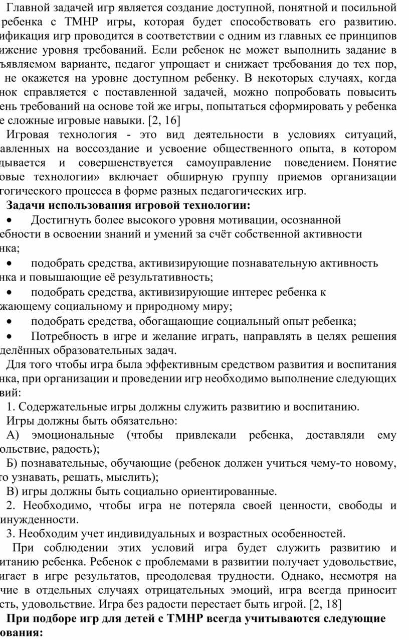 Главной задачей игр является создание доступной, понятной и посильной для ребенка с ТМНР игры, которая будет способствовать его развитию. Модификация игр проводится в соответствии с одним из главных ее принципов – снижение уровня требований. Если ребенок не может выполнить задание в предъявляемом варианте, педагог упрощает и снижает требования до тех пор, пока не окажется на уровне доступном ребенку. В некоторых случаях, когда ребенок справляется с поставленной задачей, можно попробовать повысить уровень требований на основе той же игры, попытаться сформировать у ребенка более сложные игровые навыки. [2, 16]