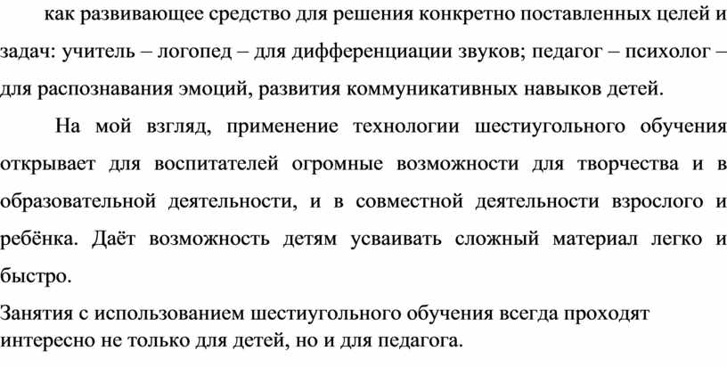 За короткое время шестиугольная технология стала одним из любимых занятий не только для детей нашей группы, но и для педагогов детского сада и родителей. Специалисты детского сада используют шестиугольное обучение как развивающее средство для решения конкретно поставленных целей и задач: учитель – логопед – для дифференциации звуков; педагог – психолог – для распознавания эмоций, развития коммуникативных навыков детей.