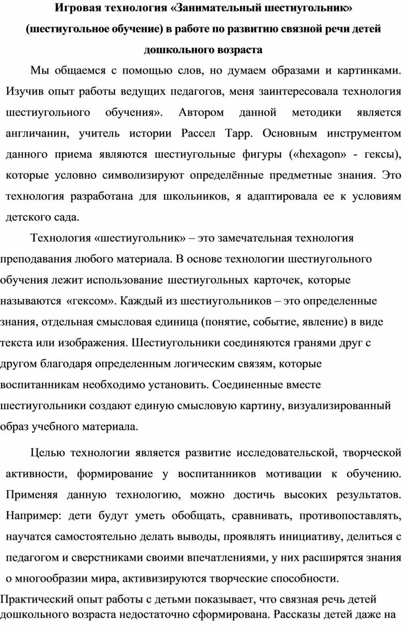 (шестиугольное обучение) в работе по развитию связной речи детей дошкольного возраста
